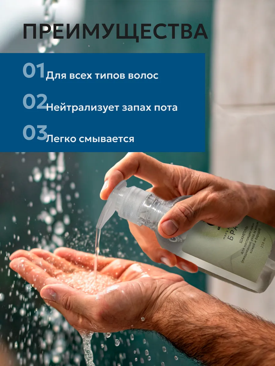 Формула без сульфатов эффективно устраняет неприятные запахи и влажность, а также способствует борьбе с перхотью, обеспечивая волосам ухоженный вид. Этот шампунь гель для душа 3 в 1 идеально подходит для мужчин с сухими, поврежденными и ломкими волосами, быстро восстанавливая их с первого применения и позволяя использовать его ежедневно. Он обеспечивает тщательное очищение и увлажнение не только волос, но и бороды, избавляя вас от дискомфорта и сухости. Его смягчающее действие заботится о вашей коже, даря ощущение свежести и бодрости.