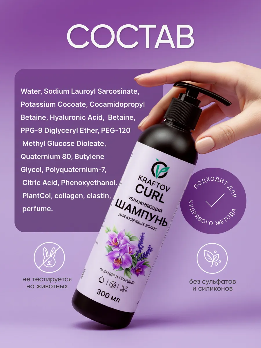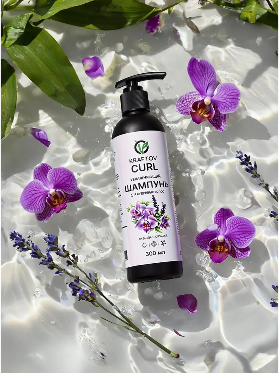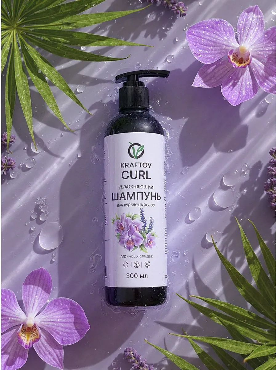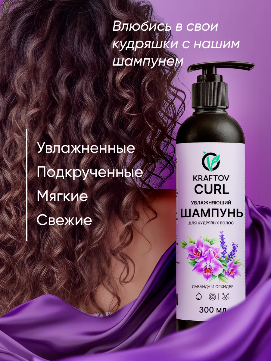 Увлажняющий шампунь KRAFTOV для кудрявых и вьющихся волос сохраняет естественную структуру завитка, бережно очищает и ухаживает за локонами.